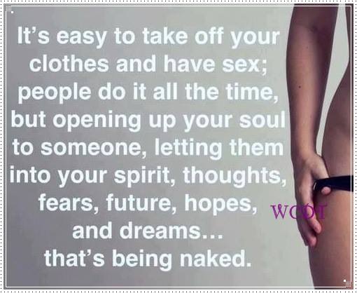 “E’ facile togliersi i vestiti e fare sesso; la gente lo fa di continuo. Ma aprire l’anima a qualcuno, permettergli di entrare dentro il tuo spirito, i tuoi pensieri, le tue paure, il tuo futuro, le tue speranze e i tuoi sogni… quello è essere nuda”