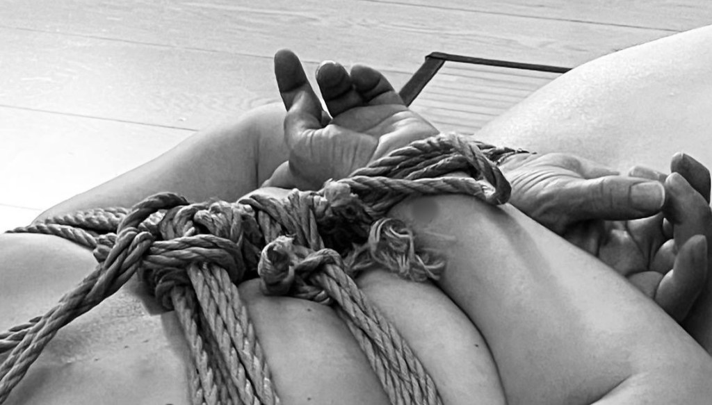 Mi siedo in seiza e accolgo il gote che mi stringi addosso. Stavolta è stretto, davvero stretto, sin dall’inizio. Ti avanza corda, addirittura. Fai un giro in più dietro con la prima, con la seconda arrivi largo per chiudere tutto. La respirazione cambia, mi sento costretta ma non più in senso negativo. Questa costrizione è dolorosa e scomoda ma non disagevole; non arriva da un desiderio di “fare bene” ma da un ascolto di me, di te, delle corde.